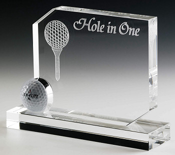 A simply excellent contemporary golf trophy in optical glass presented on a clear base.
